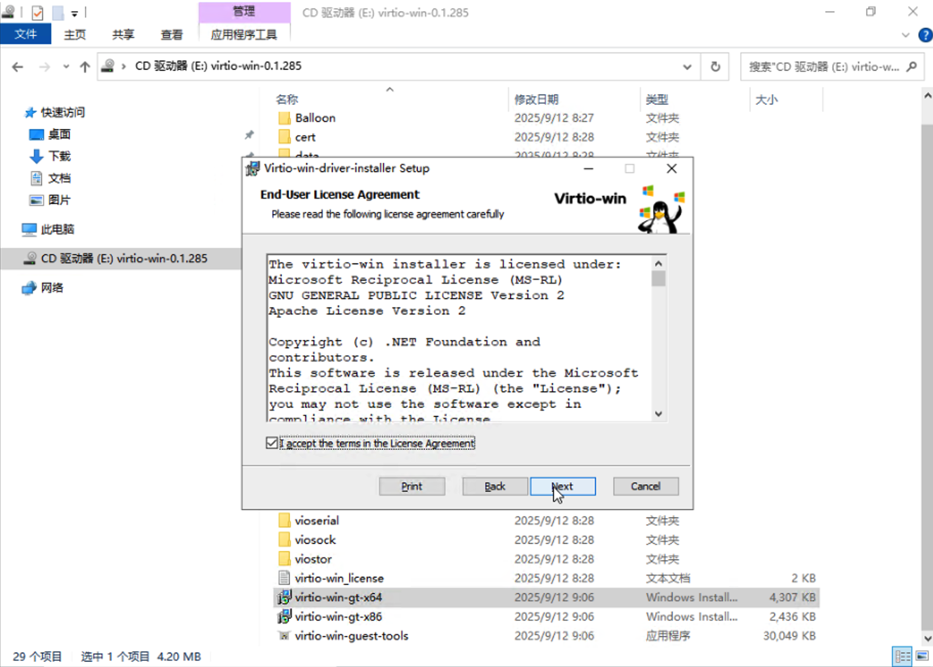 virtio-win-gt-x64 主要用于安装设备驱动(网卡/磁盘等),一路“下一步”即可。
