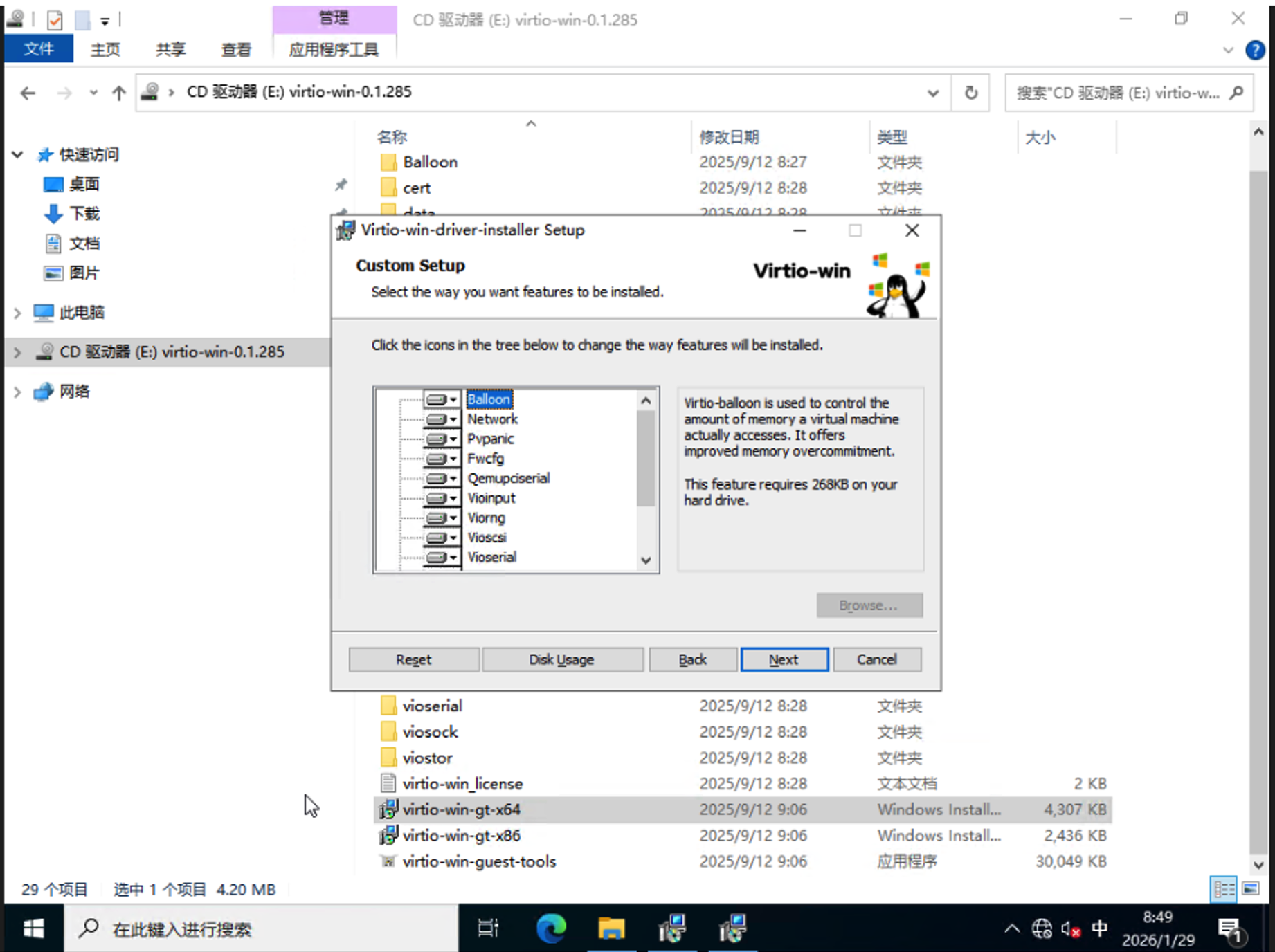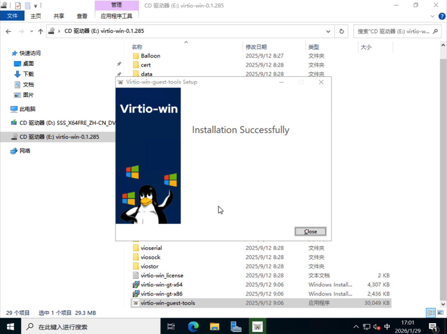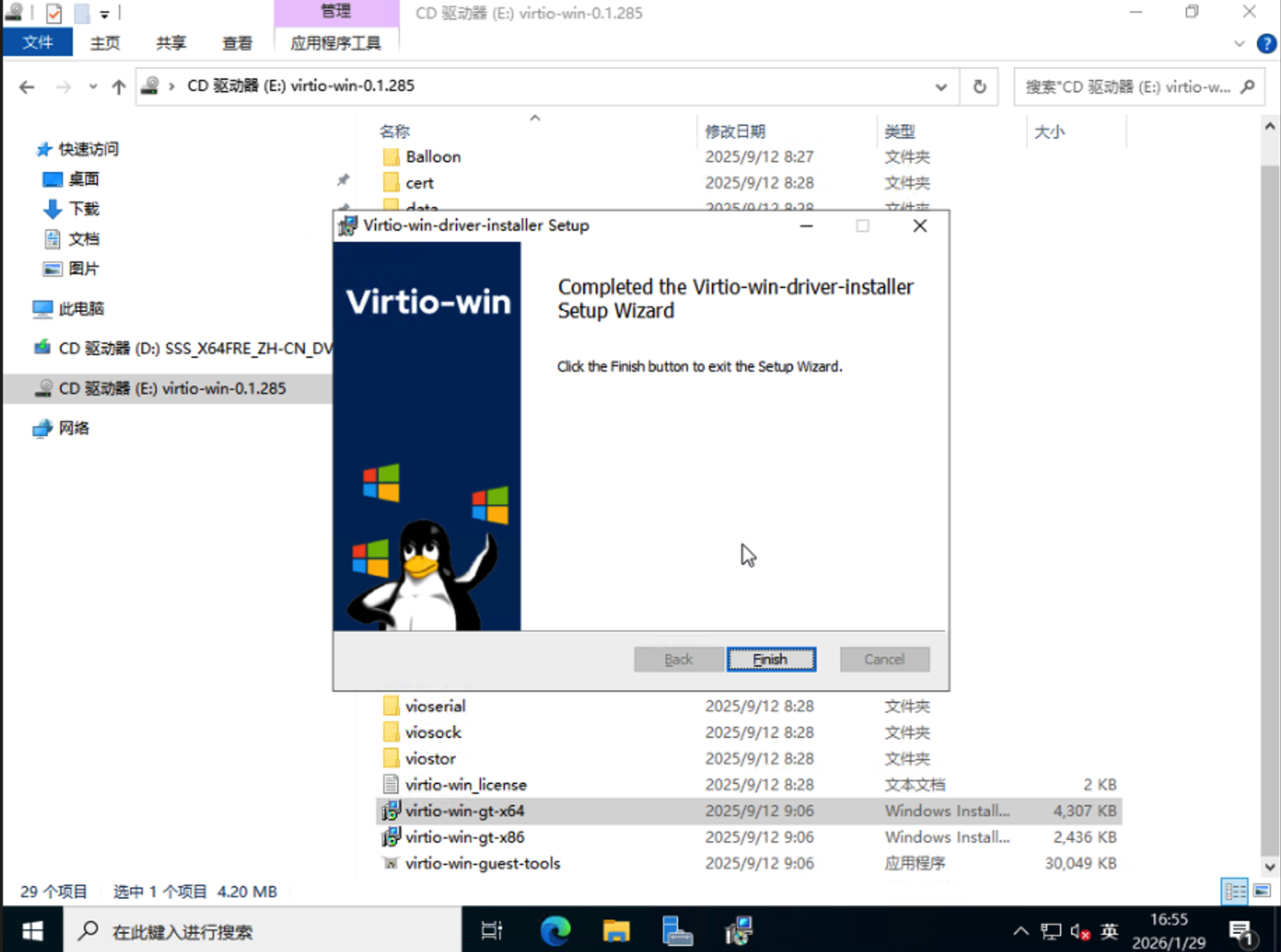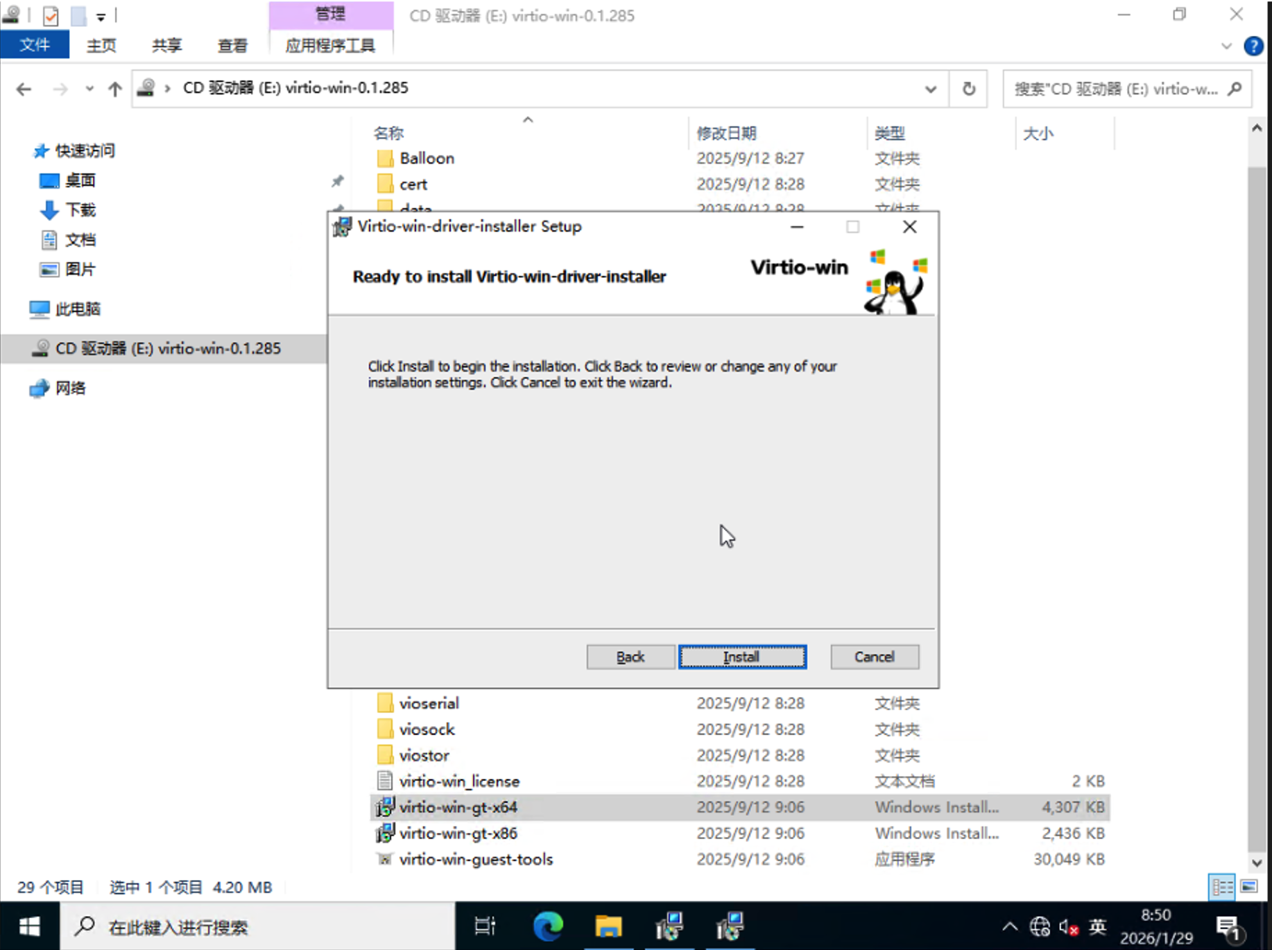 系统安装完成并完成基础配置后,在虚拟机内安装 VirtIO 的驱动与工具(通过挂载的 ISO)。