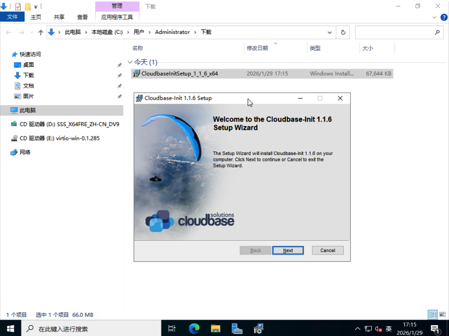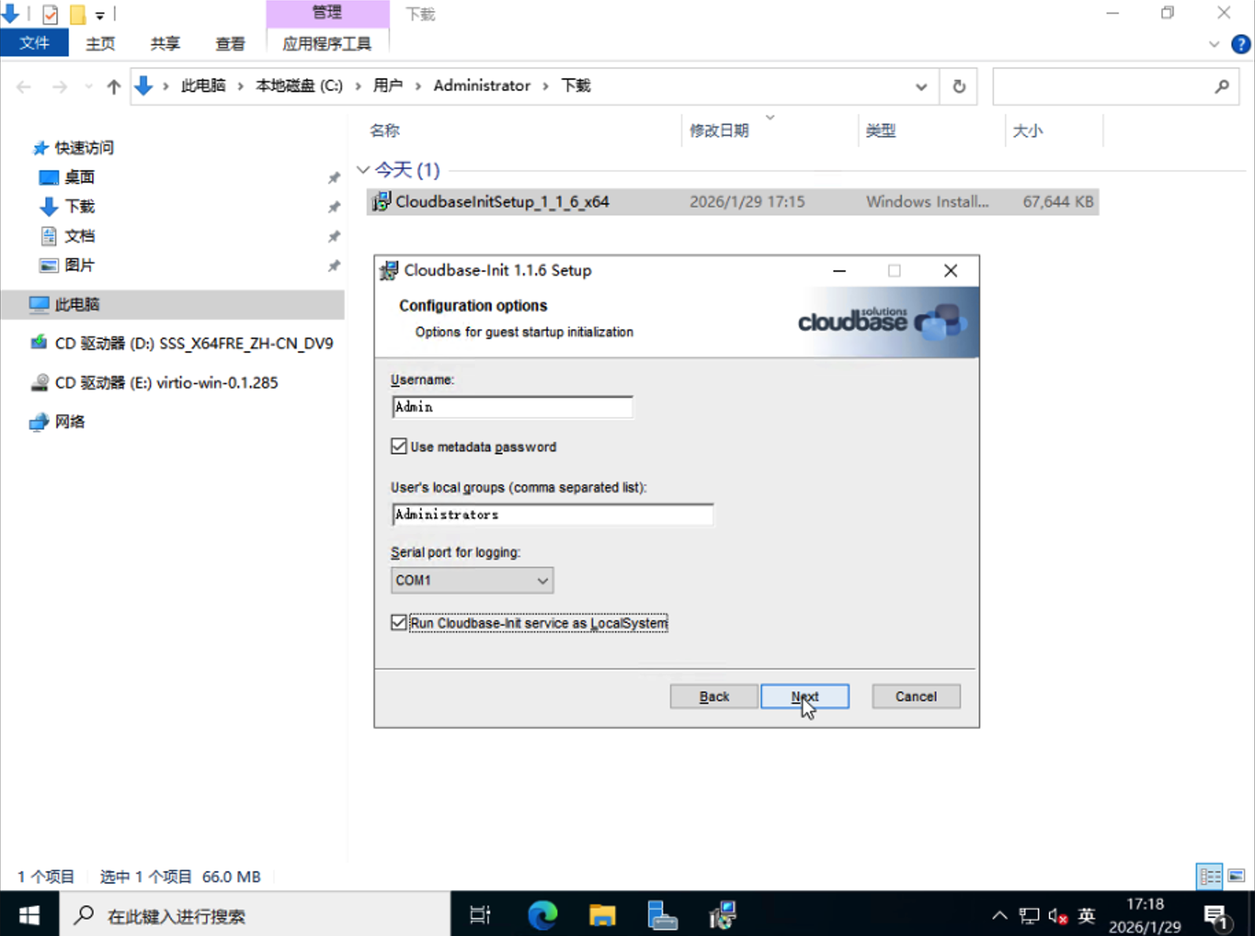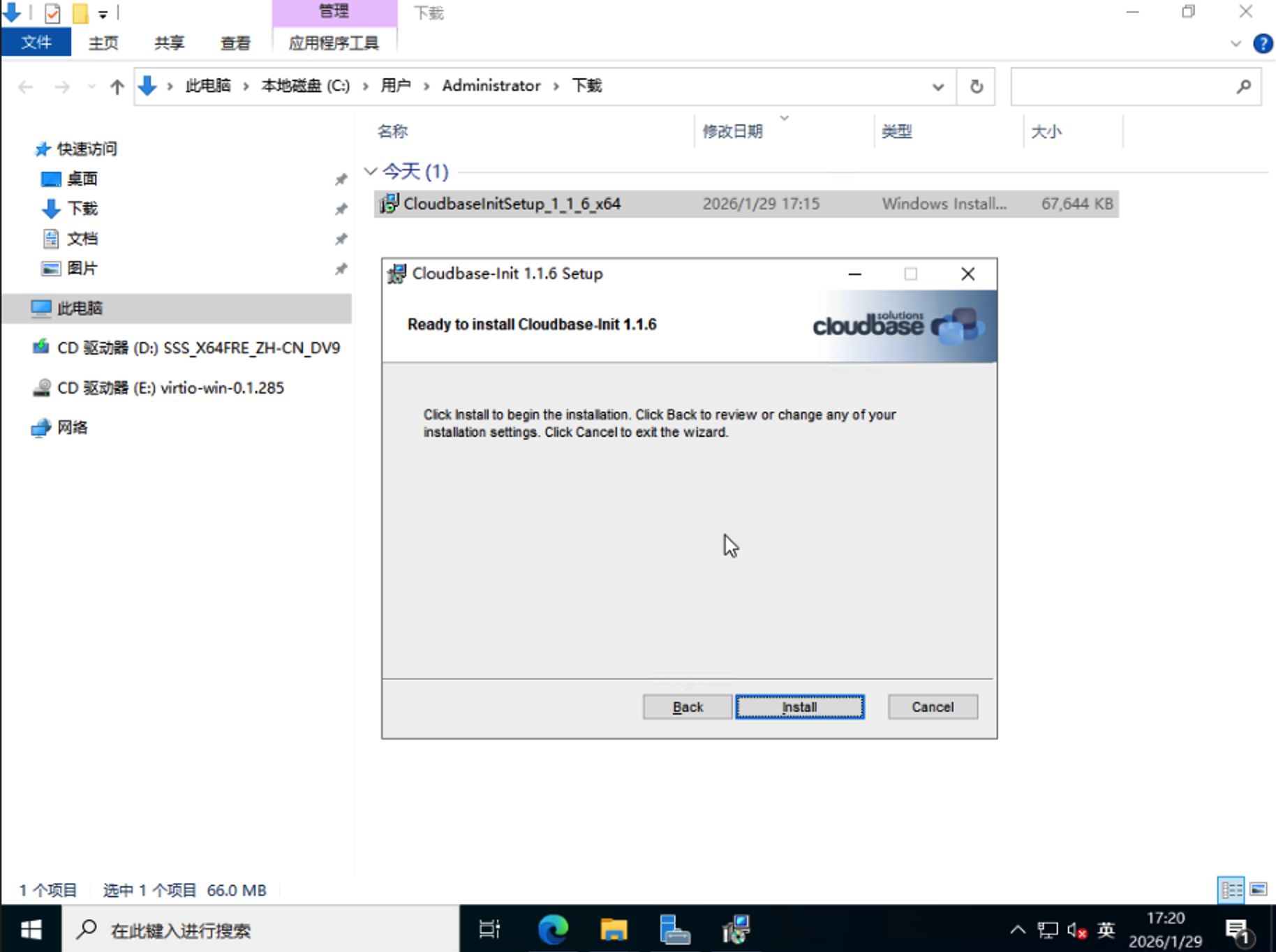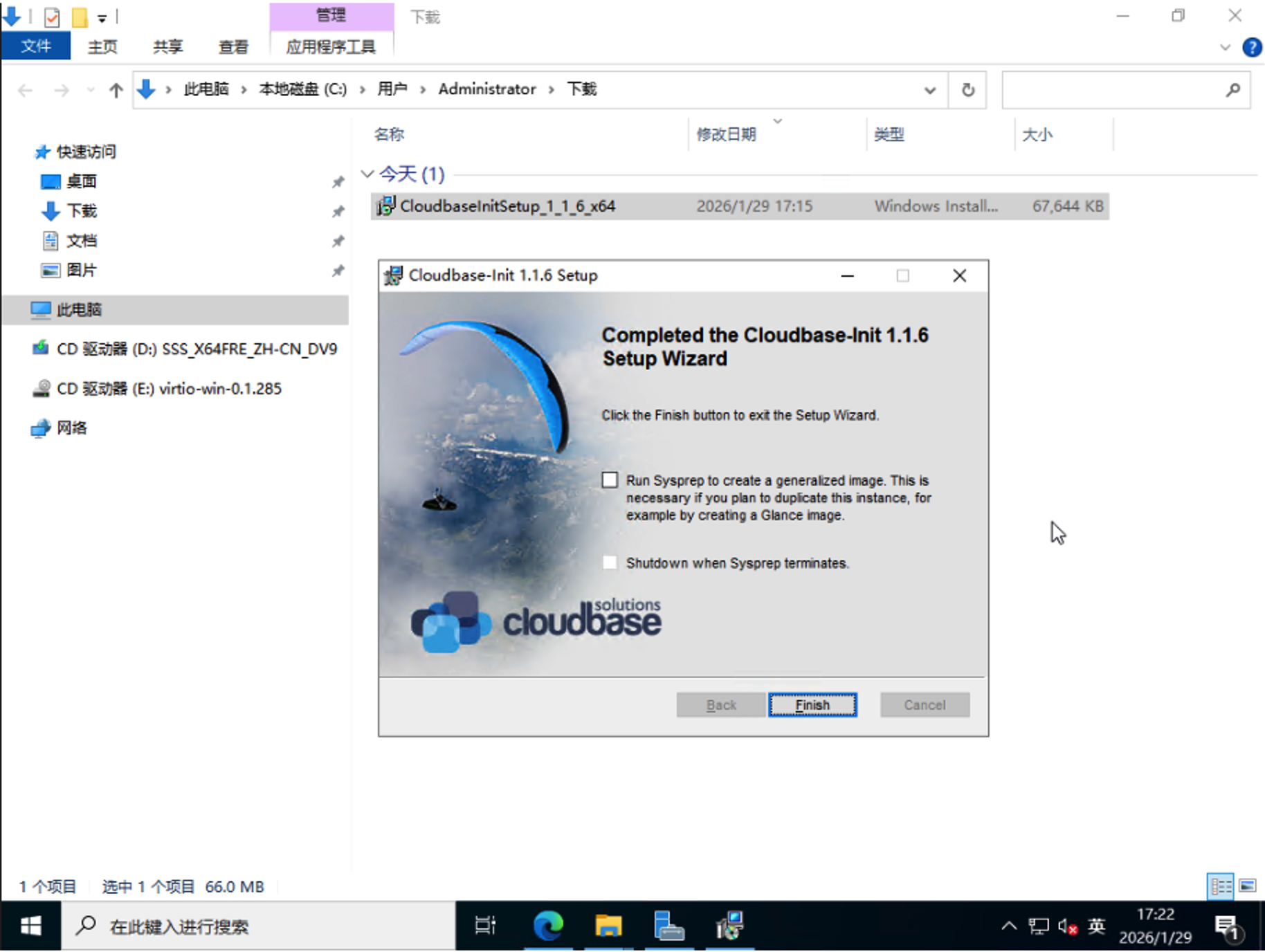 在 Windows 虚拟机中下载并安装 cloudbase-init(本文示例版本:1.1.6)。